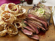 4. Transfer the steak to a cutting board; brush with some of the herb butter, tent with foil and let rest for about 10 minutes. Thinly slice against the grain; top with more herb butter and drizzle with the pan juices. |