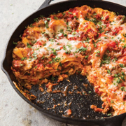 1. Adjust oven rack to middle position and heat oven to 400 degrees. Pulse tomatoes and their juice in food processor until coarsely ground, about 10 pulses. 2. Heat 12-inch cast-iron skillet over medium heat for 3 minutes. Add oil and heat until shimmering. Add onion and 1/2 teaspoon salt and cook until softened and lightly browned, 5 to 7 minutes. Stir in garlic and pepper flakes and cook until fragrant, about 30 seconds. Add sausage and cook, breaking up meat with wooden spoon, until no longer pink, about 5 minutes. Stir in processed tomatoes, bring to simmer, and cook until sauce is slightly thickened, about 10 minutes; transfer to bowl. 3. In separate bowl, combine ricotta, egg yolk, thyme, 1/2 teaspoon salt, and 1/2 teaspoon pepper. Combine mozzarella and Parmesan in third bowl. 4. Spread 3/4 cup sauce over bottom of now-empty skillet. Shingle 7 noodle halves around edge of skillet and place 1 noodle half in center. Dollop one-third of ricotta mixture over noodles, then top with one-quarter of mozzarella mixture and one-third of remaining sauce (in that order). Repeat layering process twice, beginning with noodles and ending with sauce. Top with remaining mozzarella mixture. 5. Transfer skillet to oven and bake until cheese is golden brown and lasagna is bubbling around edges, 30 to 40 minutes. Let lasagna cool for 10 minutes, then sprinkle with basil and serve. |