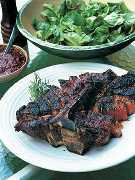 2. When the fire is medium hot (you'll be able to hold your hand just above the grate for 2 seconds), scrape off the shallots and rosemary and drain any liquid. Rub both sides of the steak with salt. Grill the steak on one side for 8 to 10 min., keeping the smaller tenderloin section over a less intense heat. If there are flare-ups, move the steak to another part of the grill. Turn the steak and grill for another 6 to 8 min. It should be rare to medium rare at this point. |