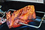1. Brine the pork belly: Score the skin side of the pork belly in a crosshatch pattern, spaced 1 inch apart, cutting through the skin and into the fat, but not into the meat. Dissolve the salt and brown sugar in the water, then add the pork belly and refrigerate for 4 to 8 hours. 2. Prepare the grill: Set the grill up for rotisserie cooking at high heat. For my Weber Summit, this means removing the grates, turning the two outer burners (burners 1 and 6) to high, and turning the infrared burner to high. Then I put my drip pan in the middle, over the unlit burners, and let the grill preheat for ten to fifteen minutes. (See here for more rotisserie setup details.) 3. Skewer the pork belly: While the grill is pre-heating, skewer the pork belly on the rotisserie spit. Aim for center mass, skewer the belly lengthwise, and secure it with the spit forks. 4. Cook the pork belly: Put the spit on the rotisserie, and cook with the lid closed. Cook on high (500*F or higher) for a half an hour to 45 minutes, until the pork belly is starting to brown. Turn the heat down to medium-low (325*F). Cook on medium-low for about 2 1/2 hours, or until the pork belly reaches 160*F internal temperature. (Pork belly is hard to overcook, so don’t worry too much about specific timing or temperature.) 5. Serve: Take the pork belly off the spit immediately, then rest for at least 15 minutes. Carve into 1/4″ thick slices and serve. |