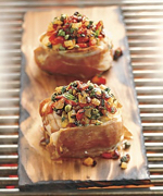 Cedar-planked Monkfish with Fire-roasted and Puttanesca Relish. To import, drag image to your MacGourmet recipe box.