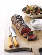 6. Meanwhile, sear beef on lightly oiled grill rack over remaining burner on high, covered with lid, turning over occasionally, until well browned, 12 to 15 minutes total. Reduce heat to moderate and cook beef, covered with lid, turning over occasionally, until thermometer inserted diagonally into center registers 120°F for medium-rare, about 10 minutes. Transfer beef to a cutting board and let stand, loosely covered with foil, 15 minutes. |